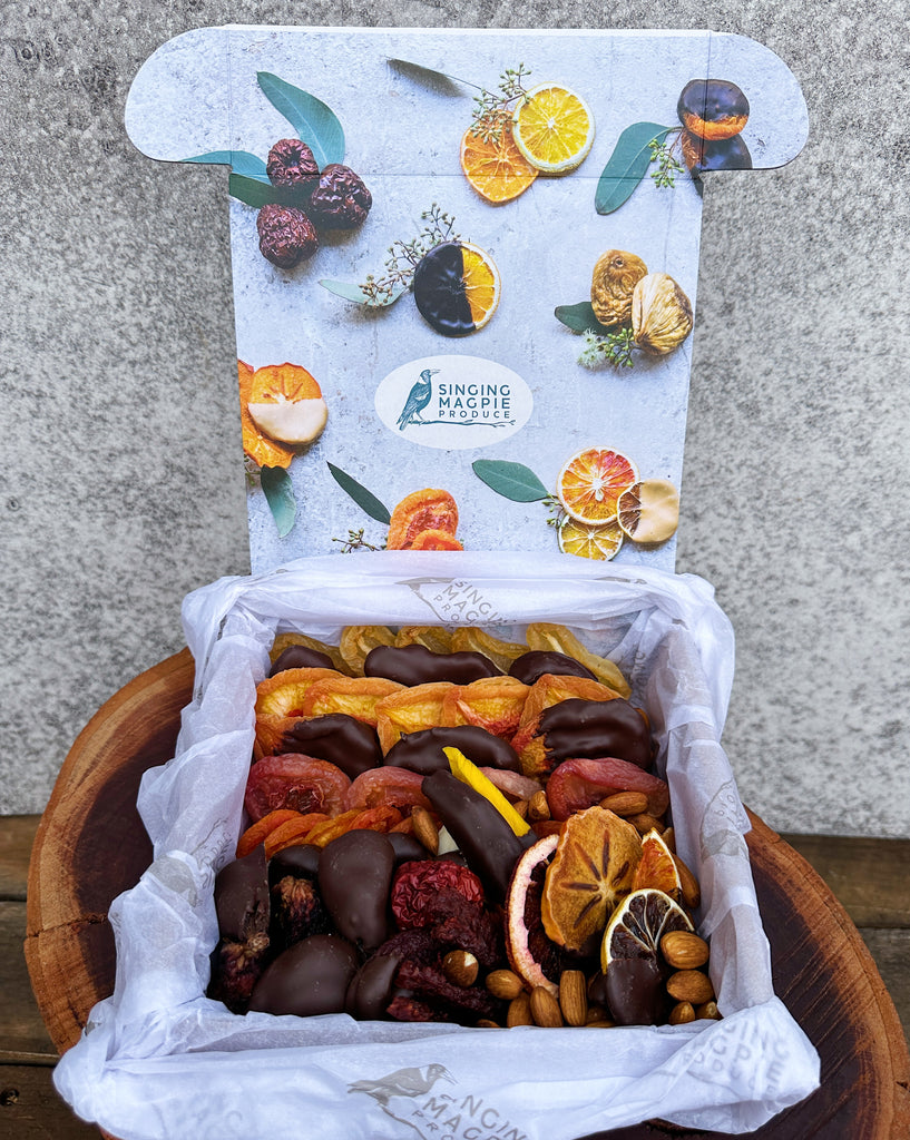 Our Riverland Fruit and Nut box ($87) is a snapshot of the quality sun dried fruit produced across our region. A perfect dinner party gift or something to share with your loved one. The box includes a mix of sun dried fruit (figs, quince, apricots, peaches, pears, citrus and persimmons) and almonds.