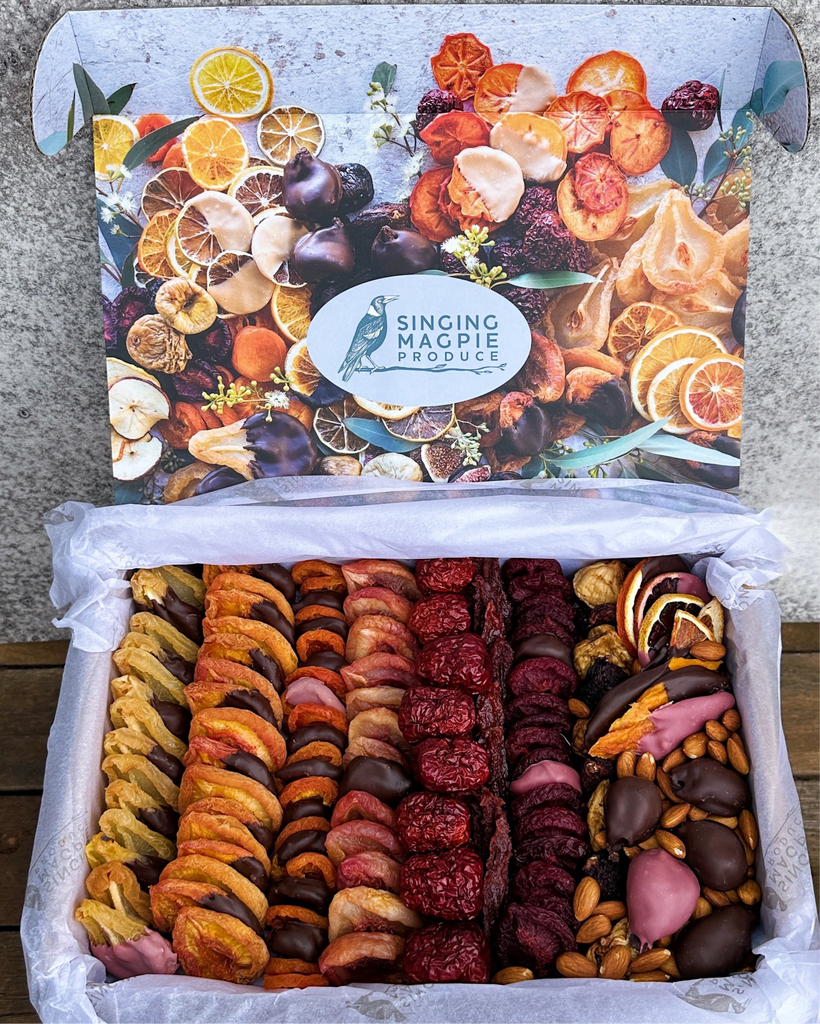 These are matched with chocolate enrobed pears, peaches, apricots, citrus, figs and mangoes (while stocks last). Please note there maybe some variability in the range provided in each box depending on availability. The Jujubes are whole and do contain a pip. Weight: Approximately 2.2kgs